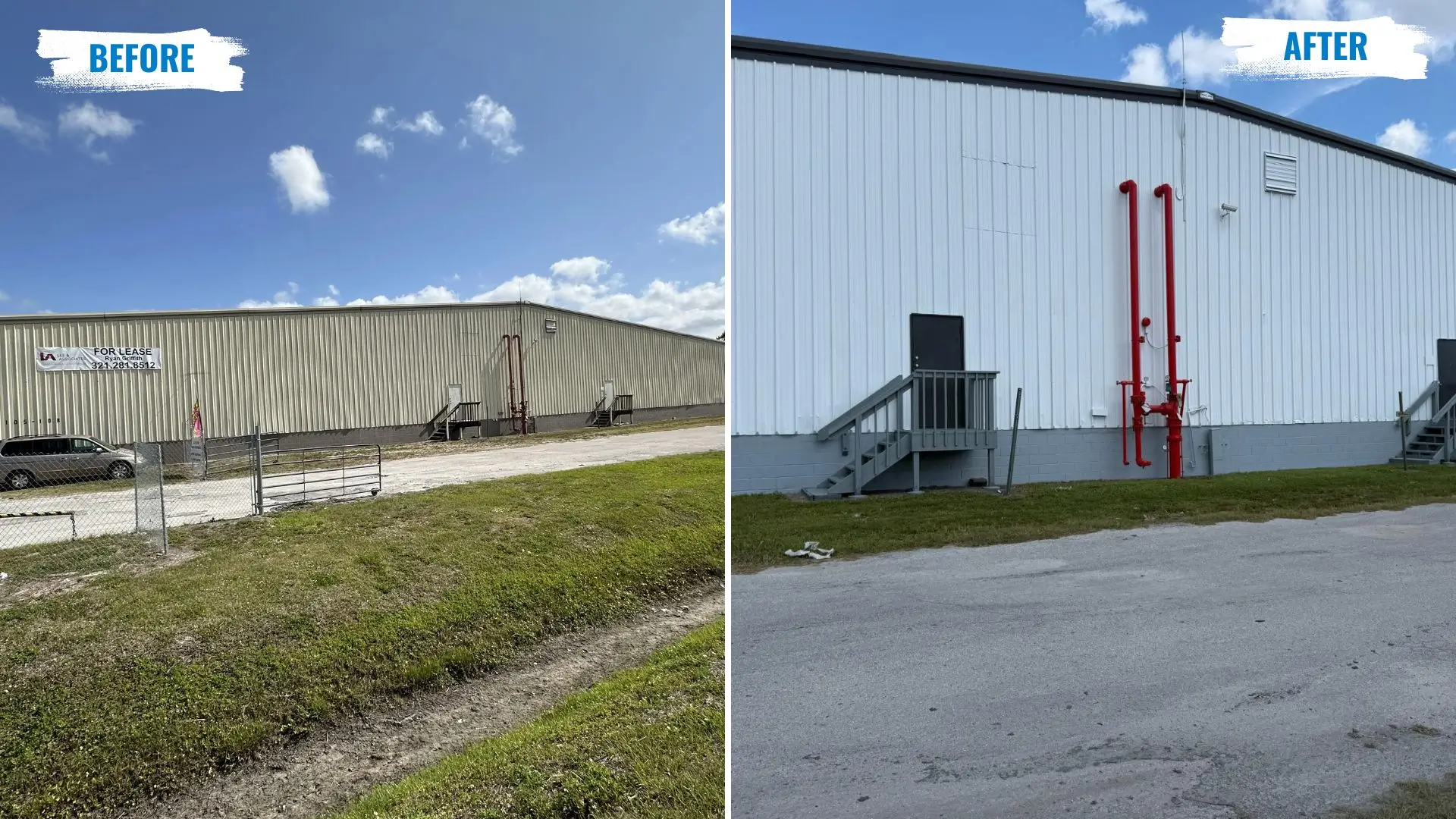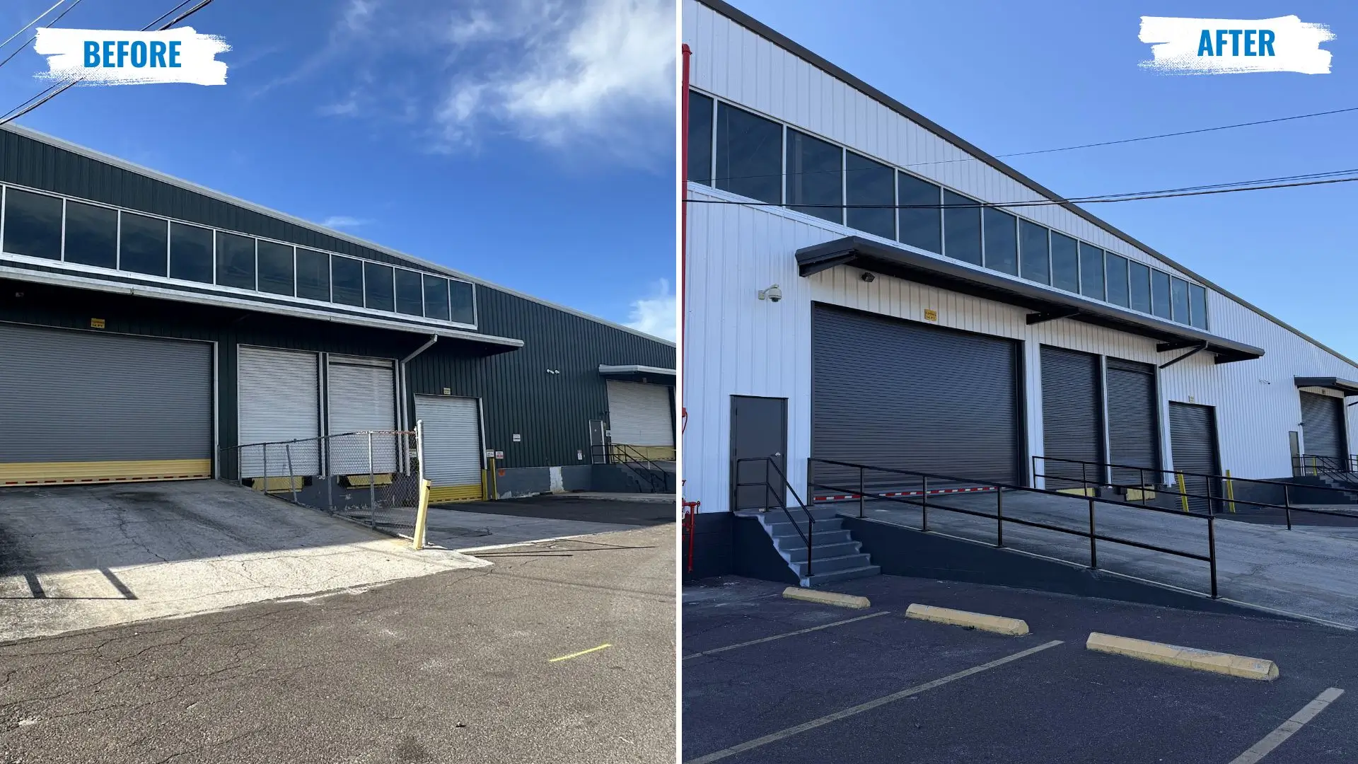 Scope: Pressure washing, surface preparation, and full exterior repaint using commercial-grade coatings designed for industrial buildings.